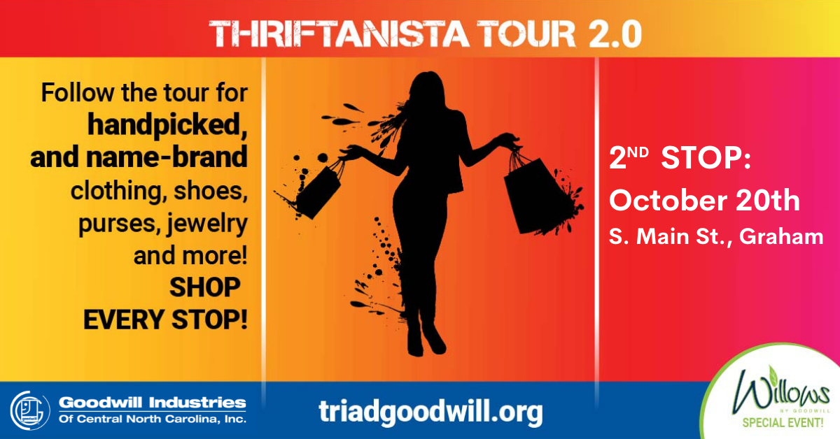 Oct 20 Thriftanista Tour 2.0 – S. Main St., Graham Featured 10:00 am - 8:00 pm Goodwill #015 841 S. Main St., Graham Event Details Get Directions